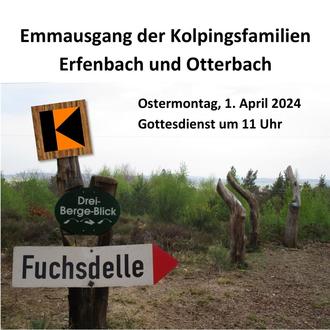 Am Ostermontag, 1. April 2024, laden die Kolpingsfamilien Otterbach und Erfenbach wieder ein den Weg nach Emmaus zu erkunden. Der ökumenische Gottesdienst findet in der Fuchsdelle statt und wird musikalisch umrahmt vom Kolping-Blasorchester Erfenbach. Im Anschluss an dem Gottesdienst wird es für die Kinder eine Osterüberraschung geben. Nachdem wir morgens aus verschiedenen Richtungen die Fuchsdelle angesteuert haben, werden wir uns zum Mittagessen gemeinsam auf den Weg ins Sportheim auf dem Schlossberg in Otterbach machen.