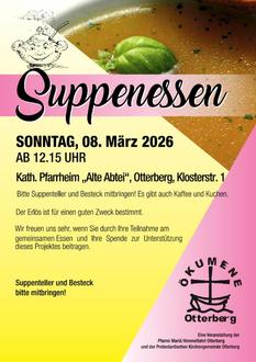 Die katholische und protestantische Kirchengemeinde in Otterberg laden herzlich ein zum ökumenischen Spendensuppenessen am 8. März ab 12:15 Uhr in der Alten Abtei, Klosterstraße 1 in Otterberg. Leckere Suppen und selbstgebackener Kuchen warten auf die Besucherinnen und Besucher; der Erlös ist für notleidende Menschen in der Republik Moldau bestimmt. Jeder ist herzlich willkommen und wird gebeten, einen eigenen Suppenteller und eigenes Besteck mitzubringen.