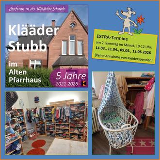 Ab dem 14.03.2026 öffnen wir unsere KlääderStubb zusätzlich zu den bewährten Dienstagsöffnungszeiten zunächst bis zur Sommerpause auch jeden zweiten Samstag im Monat, jeweils von 10:00 - 12:00 Uhr: 14.03., 11.04., 09.05. und 13.06.2026.