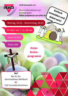 In den Osterferien bieten wir als CVJM Katzweiler wieder ein Osterferienprogramm. Dabei wollen wir mit dir gemeinsam die Ferien von Montag-Donnerstag verbringen und uns auf eine erlebnisreiche gemeinsame Zeit freuen. Wir werden actionreiche Aktionen bereit haben, kreativ werden und uns etwas auf die Spuren von Ostern machen.