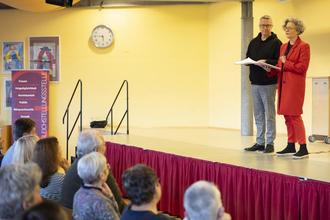 ... so hieß das Lyrik-Programm von Kerstin Bachtler und Bodo Redner am Sonntagnachmittag im Pavillon der IGS Otterberg zum Internationalen Frauentag 2025 vor ausverkauftem Haus. Eingeladen hatten die Gleichstellungsbeauftragte des Landkreises Kaiserslautern, Dorothee Müller, zusammen mit der ehrenamtlichen Gleichstellungsbeauftragten der Verbandsgemeinde Otterbach-Otterberg, Heike Thompson sowie der Vorsitzenden des Landfrauen Kreisverbandes Kaiserslautern, Else Albrecht. "Seit 1911 feiern Frauen diesen besonderen Tag oder den Internationalen Frauentag oder Weltfrauentag" erinnerte Thomson in ihrer Rede. In 26 Ländern der Welt sei dies ein gesetzlicher Feiertag. Dorothee Müller begrüßte Landrat Ralf Leßmeister sowie den Bürgermeister der Verbandsgemeinde Otterbach-Otterberg, Harald Westrich. Frau Müller bedankte sich bei den Landfrauen Katzweiler, die sich an dem Abend um das leibliche Wohl gekümmert hatten