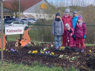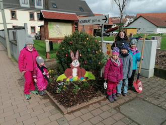 Für unsere Kleinen im Dorf ist er nicht mehr aufzuhalten. Gemeint ist der Frühling. Auch wenn er schon mal Wetterkapriolen schlägt, treiben die Krokusse und Narzissen ungebremst ihre Blüten. Ayla, Ida, Josefine, Marie, Mia und Pauline konnten auch kurze Regenschauer nicht aufhalten, als es darum ging, die ersten Boten der warmen Jahreszeit am Ortseingang zu pflanzen. Gut eingepackt in wetterfeste Kleidung, mit Schaufel und Eimer bewaffnet ging es an die Gartenarbeit. Erst wurde feiner Mutterboden gleichmäßig in die Blumenkübel verteilt und dann sorgfältig die Stiefmütterchen und Hornveilchen eingepflanzt. Freilich wurde bei dieser Transaktion jeder Regenwurm einzeln ausgiebig begutachtet und schonungsvoll ins neue Quartier verfrachtet. Dann wurden der Ortseingang und der Kerweplatz mit Blumenkästen und Osterdeko für die bevorstehende Osterzeit als Frühlingsgruß an unsere Bürger*innen, Pendler und Besucher geschmückt. Ortsbürgemeister Sven Rheinheimer und der ganze Gemeinderat wünschen allen Bürger*innen und Leser*innen ein frohes Osterfest.