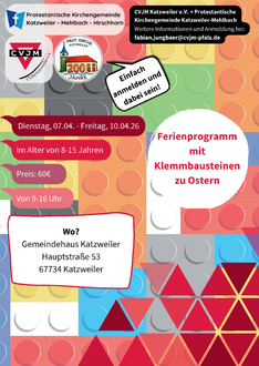 In den Osterferien laden wir in der Woche nach Ostern zu einem Ferienprogramm rund um Klemmbausteine ein. Im Katzweilerer Gemeindehaus treffen wir uns und wollen gemeinsam mit euch die Kirche von Katzweiler bauen und das Dorf rundherum. Außerdem soll es Zeit für Gemeinschaft, Spiel und Spaß geben. Wenn das etwas für dich ist, dann melde dich doch direkt bei unserem Jugendreferenten Fabian Jungbär an.