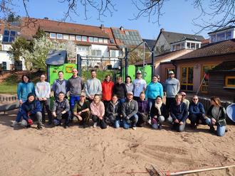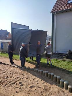 Am Samstag, den 21.03.2026 sah man ungewohnterweise Erwachsene auf dem Außengelände der Kindertagesstätte in der Bergstraße. Einige Eltern, der Hausmeister, der Leiter und die Erzieherinnen waren gekommen, um das Areal zu sanieren. Viele brachten Gartenwerkzeuge mit und so wurden Hecken geschnitten, kaputte Spielzeuge aussortiert und ein marodes Gartenhäuschen mit vereinten Kräften abgerissen. An dessen Stelle wurde ein neues aus Blech aufgestellt - ein Geschenk von Kindergarteneltern. Vielen Dank dafür!