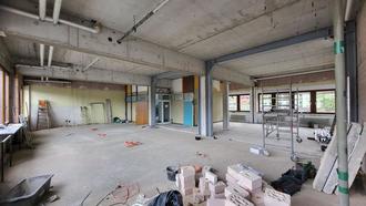 Der Umbau innerhalb des Verwaltungsgebäudes geht mit schnellen Schritten voran und liegt exakt im Zeitplan. Der zweite Rettungsweg über die angebaute Stahltreppe ist weitgehend hergestellt. Der Ratssaal wurde komplett entkernt und befindet sich im Wiederaufbau.