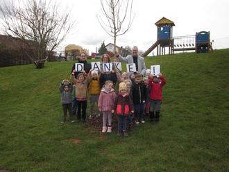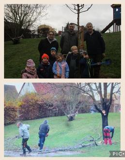 Ein herzliches Dankeschön sagt die Kita der Firma Fielmann für die großzügige Baumspende, Benny, Tobi und Jan für das Fällen der Kastanie und Herrn Butenschön für das Pflanzen des neuen Baumes. Die Kinder beobachten jetzt im Frühling begeistert das Wachsen des Baumes.