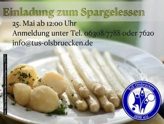 Der TuS Olsbrücken lädt seine Mitglieder und Freunde am 25. Mai zum Spargelessen ein. Unser Koch wird für Euch das Edelgemüse in verschiedenen Variationen mit und ohne Fleisch zubereiten. Anmeldungen nehmen wir ab sofort unter Telefon 06308 7788 oder per mail an info@tus-olsbruecken.de entgegen.