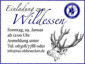 Der TuS Olsbrücken eröffnet am Sonntag, 29. Januar sein kulinarisches Jahr 2023 mit einem Wildessen, zu dem Mitglieder und Freunde herzlich eingeladen sind. Anmeldungen werden ab sofort entgegen genommen.