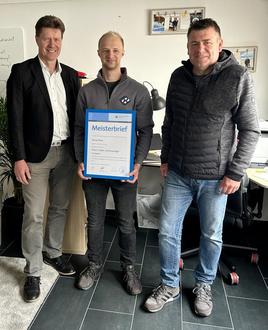 Verbandsbürgermeister Harald Westrich und Ortsbürgermeister Marco Reschke gratulierten Rene Preis zur erfolgreichen Eröffnung seines Fliesenlegerbetriebes. Seit dem 1. Mai 2023 ist Herr Preis nun offiziell als selbstständiger Fliesenleger tätig.