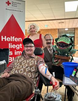 Dass diesen Termin kostümierte Schauspieler der Freilichtbühne, die auch selbst Blut spendeten, gemeinsam mit ihrem Vorstandsmitglied Jannis Leisengang begleitet haben, war der Höhepunkt. Zum ersten Mal zeigte sich dabei die exotische Pflanze AudreyII aus dem Kultmusical „Der kleine Horrorladen“.