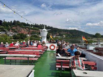 Erste Anlaufstelle war die Mosel. Dort erwartete uns eine 1-stündige Rundfahrt mit einem Fahrgastschiff, die allen viel Spaß machte. Ergab sich doch die Gelegenheit bei einem Gläschen Moselwein ganz entspannt die Aussicht auf die Weinberge zu genießen.