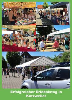 Am Sonntag den 11. Mai hat der Touristikverein Katzweiler den Erlebnistag veranstaltet. Vereine, Betriebe und Aussteller aus Katzweiler und der Region präsentierten sich mit Infoständen und qualitativ guter Ware dem Publikum. Für jeden war etwas dabei, von Handarbeitsbedarf über Pflegeprodukte bis zur Kleidung, ebenso ausreichend Ess- und Trinkmöglichkeiten.