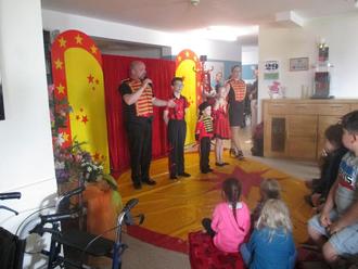 Am Mittwoch, den 28.05.2024 war es wieder soweit. Das Altenheim - Senium Seniorenhilfe in Otterbach hat unsere Vorwitznasen erneut eingeladen. Gemeinsam mit den Bewohnern wurden wir in eine kleine Welt von Magie und Akrobatik entführt. Die Familie Frankordi mit ihrem gleichnamigen fahrenden Zirkus war zu Besuch. Bevor es losging, wurden wir mit Zuckerwatte, Popcorn und einem Päckchen Caprisonne für jedes Kind begrüßt. Die Kinder waren ganz begeistert und staunten mit großen Augen über die Zauber, - und Akrobatikkünste. Ein besonderes Highlight war der Streichelzoo auf dem Vorplatz des Altenheimes. Es gab Ziegen, Ponys, ein Esel, Alpakas und Laufenten, die von den Kindern gefüttert und gestreichelt werden durften. Viel zu schnell ging die Zeit vorbei und wir verabschiedeten und bedankten uns bei der Zirkusfamilie und den Beschäftigten des Altenheimes für die Einladung und den eindrucksvollen Mittag.