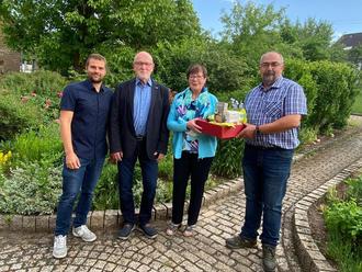 Für die Ortsgemeinde gratulierten Steffen Zimmermann und Holger Bossong mit einem Präsentkorb. Sie wünschten vor allem Gesundheit und noch viele GEMEINSAME Ehejahre im Elternhaus von Birgit Schuster. Darüber hinaus bedankten sich Steffen und Holger für das große ehrenamtliche Engagement in den Vereinen: Paul Schuster ist langjähriger Vorsitzender des MGVs – Birgit führt seit über 20 Jahren die Kasse der Festhallengemeinschaft und beide sind aus den Festivitäten und der Verwaltung rund um die Halle nicht wegzudenken. Gemeinsam sind nochmal ein paar Anekdoten aus den vergangenen Jahren erzählt worden und man schwelgte in der Vergangenheit, ohne den Blick nach vorne auf das, was ist und kommt, zu verlieren.