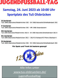Zum 125-jährigen Jubiläums veranstaltet der TuS Olsbrücken den ersten Jugendfußballtag. Folgende Spiele finden ab 10:00 Uhr statt:
