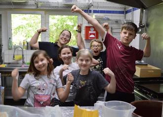 Highlight der Freizeit war die Ausbildung zum Ninja. Um den Weg als Ninja zu bestreiten, ist die entsprechende Ausrüstung nötig. In Workshops bemalten die Kinder Ninja-Stirnbänder, bastelten Nunchakus und Wurfsterne und bleichten Ninja-Shirts. Ohne Mampf kein Kampf war das Motto beim Ninja-Kekse backen! Dabei kam auch die Ninja-Tarnbemalung mit Mehl nicht zu kurz, wenngleich gemunkelt wurde, dass dies ein spontanes Upgrade des Keks-Workshops war.