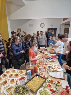 Zum Abschluss der Projektwoche kamen dann Eltern, Großeltern, Geschwister, Bekannte und Nachbarn zum Stöbern, Kaufen und Schlemmen. Im Elterncafé konnte man gegen eine Spende gemütlich Kaffee, leckeren Kuchen, Quiches, herzhafte Snacks und selbstgemachte Limonaden probieren, die die Eltern gesponsert hatten. Daneben wurden viele der in der Woche entstandenen Deko- und kulinarischen Artikel von den Kindern verkauft.