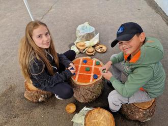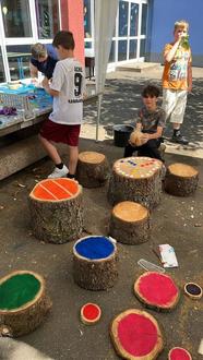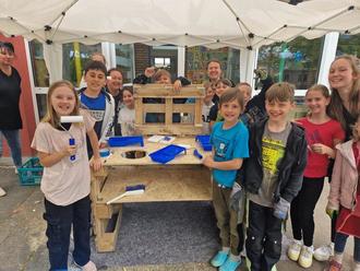 Gemeinsam lautete das Ziel: Wir wollen unseren Schulhof ansprechender und gemütlicher gestalten, indem hier zukünftig viele schöne Blumen, Pflanzen und allerlei zum Naschen wachsen darf. Schnell war klar, dass man hierzu einige Helfer benötigt, die uns sowohl mit Materialien versorgen als auch tatkräftig mitanpacken müssen. Einige Eltern legten daher kurzerhand schon vor unserer Projektwoche in Eigenregie zwei große Hochbeete an, die es dann zu bepflanzen galt. Nach einer langen Planungsphase wurde es dann endlich konkret für unsere Projektwoche: Gemeinsam mit ein paar engagierten Eltern boten die Lehrerinnen verschiedene kurze und lange Workshops an, zwischen denen die Kinder auswählen durften. So konnten sie jeden Tag etwas Neues ausprobieren und viele Eindrücke zum Thema „Garten“ sammeln. Dabei wurde entdeckt, gesucht, gefunden, gebastelt, gepflanzt, genäht, gebacken, geplottet, bemalt, mit verschiedenen Sinnen wahrgenommen und auch mal meditiert. Daneben entstanden eine Spielküche und „Spielbretter“ auf Baumstümpfen für den Schulhof. Am Ende der Woche konnten die Gruppen stolz tolle Windlichter, Gartenschilder, Kräutertöpfchen, Samentütchen, Wimpelketten und vieles mehr zeigen- und zum Kauf anbieten!!