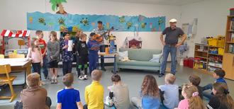 Gebannt lauschten zuerst die Kinder der 1. und 2. Klasse, anschließend die größeren aus der 3. und 4. Klasse der von Harald Michel mitreißend vorgetragenen Kurzfassung der bekannten Geschichte von Erich Kästner.