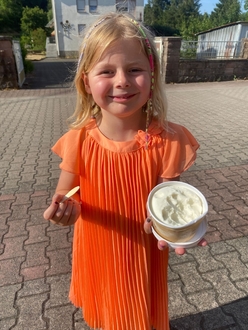 Die Geschmacksrichtung wird mit Zimt, Lebkuchen, Bratapfelgeschmack u. ä. der Jahreszeit angepasst sein. Wie man sieht, schmeckt der kleinen Emma das Eis augenscheinlich sehr gut, was der Autor dieser Zeilen nur bestätigen kann. Wir danken der Familie Krehbiel für die Aufstellung des Automaten und hoffen, dass er gut angenommen wird.