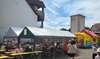 Während des Festes vergnügten sich einige Kinder auf der Hüpfburg, aber Spaß für Groß und Klein bereitete das selbstgebaute Glücksrad mit vielen kleinen Gewinnmöglichkeiten sowie der Chance auf den Hauptgewinn: eine Eintrittskarte für den Erlebnispark Tripsdrill in Cleebronn.