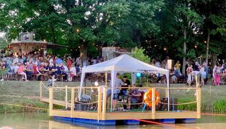 Die Abgeschiedenheit vom Verkehr, die Biertische im kühlen Schatten der Bäume, der Weiher im sommerlichen Abendlicht der untergehenden Sonne, im Hintergrund die Weiden mit den grasenden Pferden, alles zusammen eine Oase der Entspannung. Eine bunte Beleuchtung am Ufer tauchte die Bäume, die Büsche, das Laub und die spiegelnde Wasserfläche in eine zauberhafte Abendlandschaft. Für musikalische Unterhaltung sorgten DJ Olli und das Live-Duo 7661 von der Floß-Plattform, die als schwimmende Insel im See zu Wasser gelassen wurde.