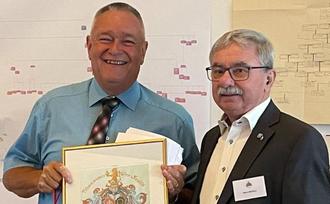 Nach dem gemeinsamen Mittagessen erläuterte Dr. Kai Ratje Mathieu die Geschichte der Otterberger Mathieu-Familien und den Text des Familienwappens. Hier heißt es: 'Die Mathieu aus Burgund stammend, sind eines guten Geschlechts und führen im blauen Feld zwei goldene Ringe, im roten Felde zwei silberne Sterne in Lilienform, welche die Reinheit der Familie bedeuten. Einen gekrönten Helm, worin ein Löwe, der eine Eichel hält, die das Wachstum des Stammes darstellt. Dieses Wappen erhielten sie unter Kaiser Ludwig der Bayer Anno 1340.'