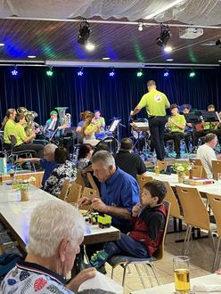 Première feierte das „Jugend“orchester, das zum ersten Mal ein komplettes Set für sein Publikum spielte. Unter die Jugendlichen haben sich seit einiger Zeit auch erwachsene Neueinsteiger gemischt, so dass es nunmehr zum Nachwuchsorchester mutiert ist. Der Dirigent beider Formationen, David Punstein, wies ausdrücklich in der Moderation darauf hin, dass weitere Neu-und Wiedereinsteiger*innen herzlich willkommen seien. Die Wucht und Klasse des großen Orchesters in voller Besetzung kam in der voll besetzten Halle besonders gut zur Geltung, da sich das Publikum dank des Regens nicht auf drinnen und draussen aufteilte.