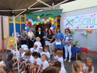 Besinnlicher wurde es bei dem Echogebet und den Fürbitten, die die Erzieherinnen sprachen. Ein Anspiel, bei dem zwei Hexen sich Gedanken über den Schuleintritt machten, bildete den Einstieg zur Mitmachgeschichte von David und Goliath. Mit Schutzschildern und kleinen Bällen „bewaffnet“ konnten sich die Kinder aktiv beteiligen. Pfarrer Albrecht bestätigte die ständige Gegenwart Gottes.