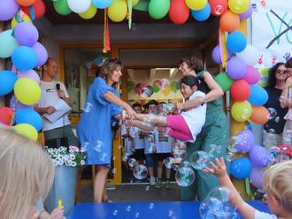 Den krönenden Abschluss bildete der symbolische „Rausschmiss“. Unter Applaus wurden die Kinder auf eine Matte geworfen. Anschließend erhielt jedes Kind seine persönliche Portfoliomappe mit einem liebevollen Brief.