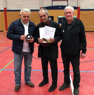 Stolz zeigt Markus Hauth (Mitte) die von DFB-Präsident Bernd Neuendorf unterzeichnete Urkunde. Links Kreisvorsitzender Udo Schönenberger, rechts Kreisehrenamtsbeauftragter Andreas Gödtel.