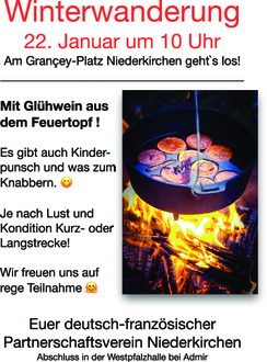 Der deutsch-französische Partnerschaftsverein beginnt das neue Jahr mit seiner traditionellen Winterwanderung. Am Sonntag, dem 22. Januar 2023 treffen sich die Wanderfreunde, zusammen mit der Wandergruppe des Pfälzerwald-Verein zum Abmarsch um 10:00 Uhr am Grancey-Platz Niederkirchen, Ortsmitte - gegenüber dem Rathaus. Die Wanderstrecke führt an der Kirche und am „Alten Friedhof“ vorbei Richtung Moorgraben, auf einem Teil der „Fünf-Berge-Tour“ entlang des Moorgrabens hoch zum Krippes, wo es Glühwein aus dem Feuertopf und Kinderpunsch gibt. Von dort führt der Wanderweg nach Morbach und danach über den Höhenweg Richtung Wörsbach und wieder ins Tal entlang des Bellenmühlbachs (Weilerbacher Weg) zur Westpfalzhalle. Die kurze Strecke führt am „Alten Friedhof“ vorbei, den asphaltierten Wirtschaftsweg hoch zum Glühweinstand auf Krippes. Zurück geht es dann wieder auf dem Harzhütterweg zur Westpfalzhalle. Zum Abschluss der Wanderung ist beim „Admir“ im Restaurant Westpfalzhalle um 12:30 Uhr ein gemeinsames Mittagsessen vorgesehen. Anschließend empfehlen wir noch den Besuch des „Wandernden Dorfcafés“ ab 14:00 Uhr im Musikerheim neben der Westpfalzhalle. Auch Nichtmitglieder sind gern gesehene Gäste. Auf zahlreiche Wanderfreunde freut sich der deutsch-französische Partnerschaftsverein Niederkirchen.