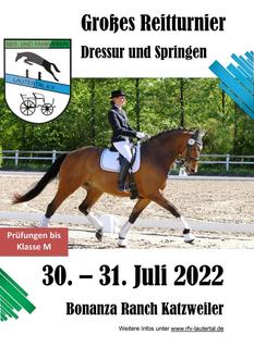 Vom 30.-31. Juli werden ambitionierte Reiterinnen und Reiter auf dem Gelände der Bonanza Ranch Katzweiler um Siege und Platzierungen kämpfen. Am Samstag werden die Reitenden in Dressurprüfungen gefordert, bevor mit dem Umbau des Dressurvierecks zum Springparcours am Samstagabend die Voraussetzungen für den letzten Turniertag geschaffen werden.