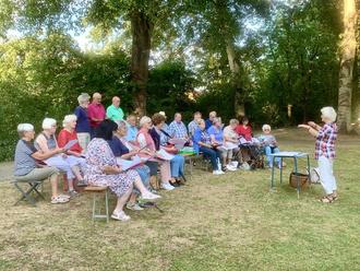 Es war ein spontaner Entschluss von Vorstand Jürgen Loepp, bei den sommerlichen Temperaturen die wöchentliche Chorprobe am Donnerstag, dem 21.07.2022 ins Frei zu verlegen. In den Proberäumen des Gemeindehauses war es zu warm und der Landschaftsweiher lädt förmlich ein zu einem gesanglichen Stelldichein. Kurzum wurden ein paar Bänke ins Auto geladen, die Notenblätter sortiert und das elektrische Klavier unter den Arm gepackt. Kühle Getränke gehörten selbstverständlich auch dazu. Am Landschaftsweiher trafen sich dann nahezu alle Aktiven des Sängerchors 1877 Katzweiler. Es dauerte nicht lange und Zuhörer gesellten sich zu der Gesangesgruppe und lauschte den harmonischen Klängen. Für diesen Abend war das für alle Beteiligten eine pure Freude: eine gelungene Chorprobe in freier Natur, ein geselliges Beisammensein und gleichzeitig die beste Werbung für den Chor selbst.