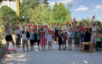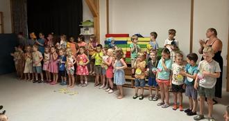 Morgens gab es eine kleine Überraschungsparty in der Kita. Alle Kita – Kinder feierten mit. Die Großen wurden mit einer Schultüte verabschiedet und die neuen Vorschulkinder mit einer Medaille begrüßt. Nachmittags kamen die Eltern und dann ging es los mit dem Rausschmiss. Jedes Vorschulkind wurde von dem Kitator in die Schule geworfen. Zum Glück war die Landung wie immer weich und die Freude der Kinder groß! Die Schlaufüchse sangen noch ein umgedichtetes Lied.