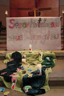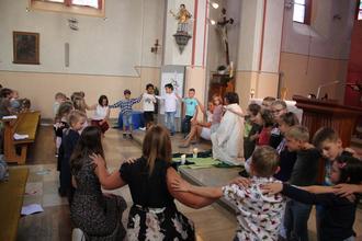 Unser diesjähriges Sommerfest startete um 15:30 Uhr in der Kath. Kirche Schallodenbach mit einem besinnlichen Wortgottesdienst, begleitet von unserer Gemeindereferentin Petra Benz, zum Thema "Spuren hinterlassen - neue Wege gehen". Die Kinder und ihre Familien versammelten sich in der Kirche, um gemeinsam diesen Moment zu teilen. Neben dem Bilderbuchkino „Ins gelobte Land“, welches erzählt und angeschaut wurde, durften die Vorschulkinder von ihren eigenen Erfahrungen aus der Kindergartenzeit berichten. Abgerundet wurde die Andacht mit mehreren Liedern, die von allen Kindern gemeinsam gesungen wurden.
