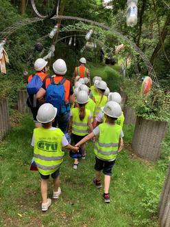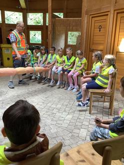 Er zeigte uns als erstes das „grüne Klassenzimmer“ indem wir uns die Ameisen Station anschauten. Außerdem hörten wir uns eine kleine Audio Aufnahme von den Ameisen an. Hendrik erklärte auch, dass die Blattschneideameisen die Blätter nicht zum Essen brauchen sondern, dass sie daraus Erde entstehen lassen (Kompost). Anschließend wurden wir alle mit einem Schutzhelm und einer Warnweste ausgestattet. Hendrik führte uns über das Gelände und durch den Wald. Dort kamen wir zu weiteren Lernstationen zum Thema Mülltrennung.
