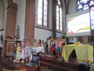 Am 15.07.24 war für unsere Vorwitznasen ein ganz besonderer Tag. Wir feierten in einer kleinen Wortgottesfeier, zusammen mit Pfarrer Hartmüller, ihren Abschied, zu dem alle Familien unserer zukünftigen Schulkinder eingeladen waren. Zu Beginn zogen die Kinder in die Kirche ein und eröffneten die Feier mit einem ersten Liedbeitrag.