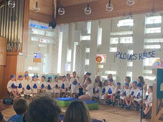 Dann hieß es: „Willkommen zu Plock‘s Reise!“ Das Publikum wurde eingeladen, einen Regentropfen auf seiner Reise zu begleiten. Die Vorschulkinder hatten ein musikalisches kleines Theaterstück auf die Beine gestellt, das mit viel Applaus belohnt wurde.