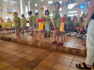 Mit einem Gebet stellte Dekan Matthias Schwarz die Kinder unter Gottes guten Segen. „Mögen Engel dich begleiten, auf dem Weg der vor dir liegt,…“ war das Segenslied der Erzieher*innen für die Kinder und ihre Familien. Am Ausgang bildeten die Erzieher*innen dann ein Spalier und zum Song „We are the World, we are the children“ wurde mit Tüchern zum „Auszug“ gewunken. So fand der Nachmittag mit einem lachenden und einem weinenden Auge seinen Ausklang.