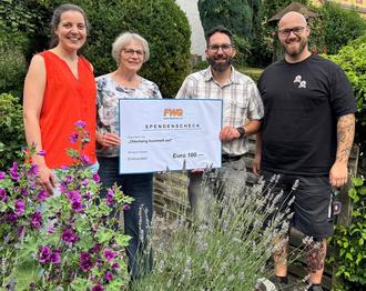 Übergabe der Spenden durch Sebastian Christmann (FWG Stadt Otterberg e. V.) sowie Markus Kobel (MT Pfalz-Landhandel) an Frau Bösen und Frau Neißer von der Initiative "Otterberg hummelt auf"