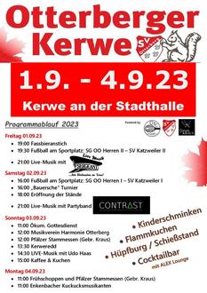 Vom 1. bis zum 4. September findet vor und in der Stadthalle die traditionelle Kerwe statt. Los geht’s am Freitag um 19.00 Uhr mit dem Fassbieranstich, und um 21.00 Uhr sorgt die Band Sergeant in der Stadthalle für Stimmung. Live-Musik steht auch am Samstag um 21.00 Uhr mit der Partyband Contrast auf dem Programm, während am Sonntag um 12.00 Uhr der Musikverein Harmonie Otterberg und ab 14.30 Uhr Udo Haas auf der Bühne vor der Stadthalle aufspielen. Den Abschluss bilden am Montag um 11.00 Uhr die Enkenbacher Kuckucksmusikanten. Daneben gibt es an allen Tagen ein attraktives Programm: Kerwefußballspiele am Freitag und Samstag, das Bauersche Turnier am Samstag, ökumenischer Gottesdienst und Kerweredd am Sonntag und zum Abschluss der Frühschoppen am Montag. Für Essen und Trinken ist natürlich ebenfalls gesorgt.