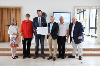 Bild (v.l.): Erste Kreisbeigeordnete Gudrun Heß-Schmidt, Stadtbürgermeisterin Martina Stein, Christian Horn, Landrat Ralf Leßmeister, Beigeordneter Martin Müller, Dr. Walter Altherr.