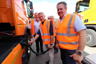 Landrat Leßmeister ließ es sich nicht nehmen, selbst hinter dem Steuer eines der neuen Fahrzeuge Platz zu nehmen und zusammen mit dem Leiter des Abfallwirtschaftsbetriebs des Landkreises Michael Mersinger und Paul Kraft eine kurze Fahrt über das Betriebsgelände zu unternehmen. Anschließend zeigte er sich von seiner persönlichen Probefahrt schwer beeindruckt: "Diese Fahrzeuge sind ein bedeutender Fortschritt für unseren Landkreis, und ihre Vorbildfunktion in Sachen Umweltschutz und Nachhaltigkeit kann gar nicht hoch genug gewertet werden!"