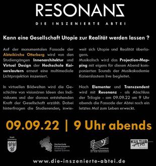 Die Stadt Otterberg veranstaltet in Kooperation mit der Hochschule Kaiserslautern und KulturART Otterberg e.V., mit Unterstützung der Musikakademie an der Emmerich-Smola-Musikschule Kaiserslautern, auf dem Kirchplatz, in und an der Abteikirche Otterberg am 09. September 2022, 21:00 Uhr mit RESONANZ - die inszenierte Abtei eine Abendveranstaltung der besonderen Art.