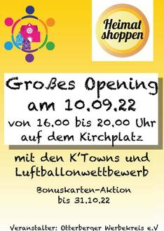 Am 10.09. von 16 bis 20 Uhr findet das große Opening zum Heimatshoppen in Otterberg auf dem Kirchplatz statt. Hierbei geht es um eine alljährliche Aktion der IHK und soll die Käufer animieren lokal einzukaufen. Der Otterberger Werbekreis startet dazu mit seinen Mitgliedern eine Punktesammelaktion. Die Eröffnung erfolgt mit Essen, Getränken, Musik, einem Luftballonwettbewerb und diversen Ausstellern.