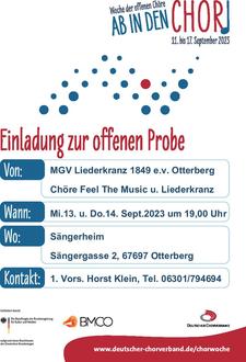Der MGV Liederkranz Otterberg lädt am Mittwoch, 13.09.2023 von 19.00 bis 21.00 Uhr mit seinem Ensemble Feel The Music und am Donnerstag, 14.09.2023 von 19.00 bis 20.30 Uhr mit seinem Traditionschor Liederkranz im Rahmen der bundesweit stattfindenden „Woche der offenen Chöre“ des Deutschen Chorverbands zu einer Schnupperprobe ein.