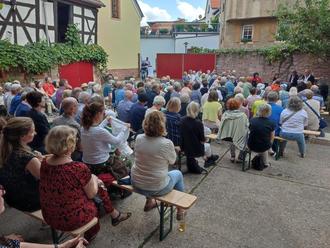 Voll des Lobs äußerten sich die Besucher sowohl über das außerordentlich genussreiche Programm als auch über die Organisation, diesmal von Gerhard und Moni Winter mit Team, und das schöne Ambiente im Hof der Eigentümer Carolin und Armin Jörg. Stehende Ovationen für die 4 Künstler und eine abschließende Zugabe der Musiker beendeten die Veranstaltung.