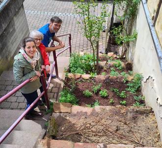 Die sandigen Flächen im oberen Bereich der Treppe bleiben im Übrigen frei von Pflanzen, damit die im Boden lebenden Wildbienen dort nisten können. Eine Gefahr geht von diesen Wildbienen nicht aus, da sie im Gegensatz zu den Honigbienen als Einzelgänger leben und keine Staaten bilden.