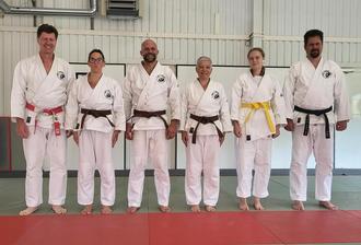 Wiebke Luig, Nicole Treptow und Andreas Götzinger stellten sich der Herausforderung, in nicht ganz so jungen Jahren ihre Braungurtprüfung abzulegen. Die 50-, 47- und 53-Jährigen hatten sich in den letzten Monaten intensiv auf den Tag vorbereitet und waren sichtlich nervös als es losging. Alle vier Prüflinge zeigten ihr Können in den Bereichen des Jiu Jitsu. Dazu gehörten Würfe und Hebel, aber auch Abwehren gegen Kontaktangriffe. Ebenfalls Waffenabwehren gegen Stock- und Messerangriffe und Abwehren gegen Schläge und Tritte hatten alle drei im Programm.